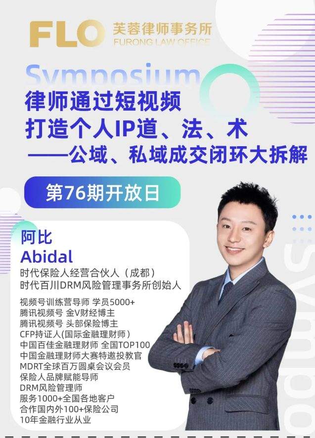 如何用短视频打造强信任IP?法律人IP的「专业信任链」设计法则,短视频时代个人IP的“道、法、术”大公开!2025年7月22日(周二)14:30,湖南芙蓉律师事务所举办第76期开放日活动!活动邀请时代保险人经营合伙人(成都)、时代百川DRM风险管理事务所创始人、腾讯视频号金V财经博主、腾讯视频号头部保险博主、CFP持证人(国际金融理财师)、中国百佳金融理财师全国TOP100、中国金融理财师大赛特邀投教官、MDRT全球百万圆桌会议会员、保险人品牌赋能导师、DRM风险管理师阿比(Aidal)作为主讲人带来《律师通过短视频打造个人IP道法术,公域、私域成交闭环大拆解》的主题分享!
